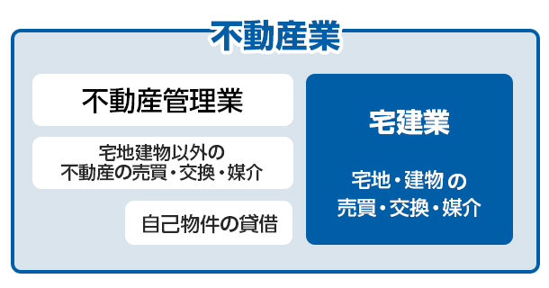 さらに、不動産業には、売買、賃貸、仲介(媒介)、管理(例:分譲マンションの管理、賃貸物件の管理等)などの業種がありますが、宅建業は、不動産業のうちの一部、売買や仲介といった取引(流通)を取り扱う業種のみが含まれますので、「管理業」は宅建業に含まれないことになります。