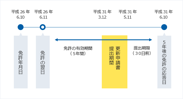 起算日:免許年月日(実際に営業できるのは、供託後諸手続きが終わってから)